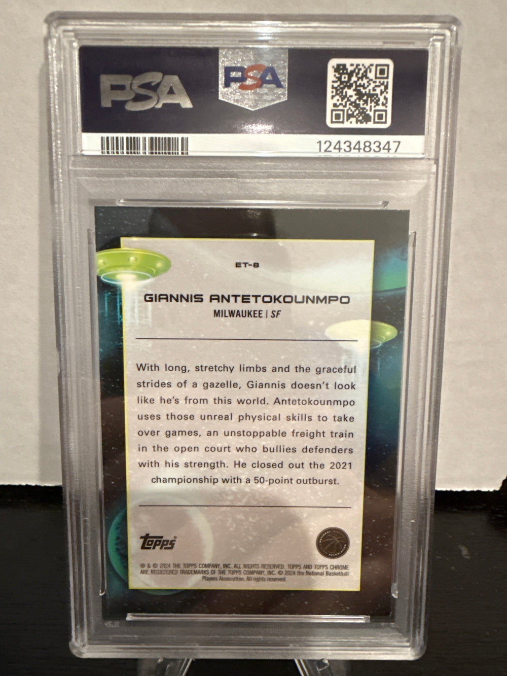 Giannis Antetokounmpo 2023 Topps Chrome Cosmic Extraterrestrial Talent, PSA 10 Gem Mint, Card Number ET8PSA Certification 124348347Card Stand sold separately.