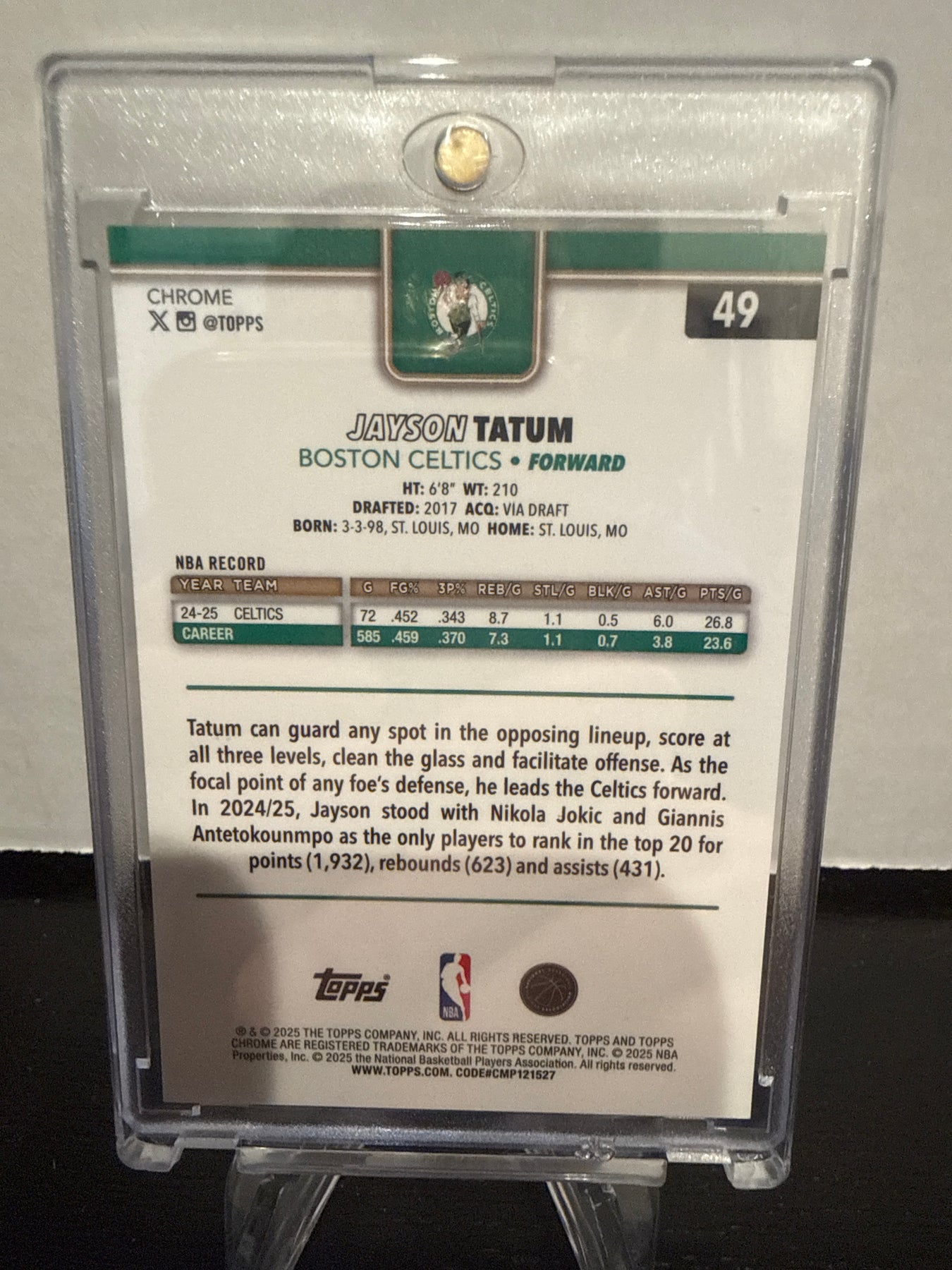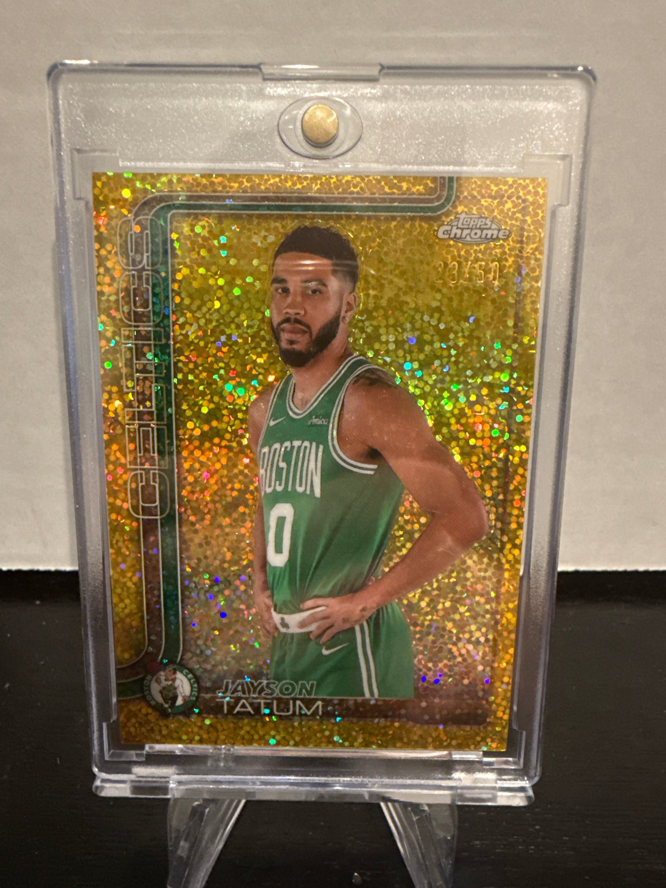 Jayson Tatum 2025 Topps Chrome Gold Image Variation Gold Mini Diamond, 23/50, Card Number 49Card Stand sold separately.