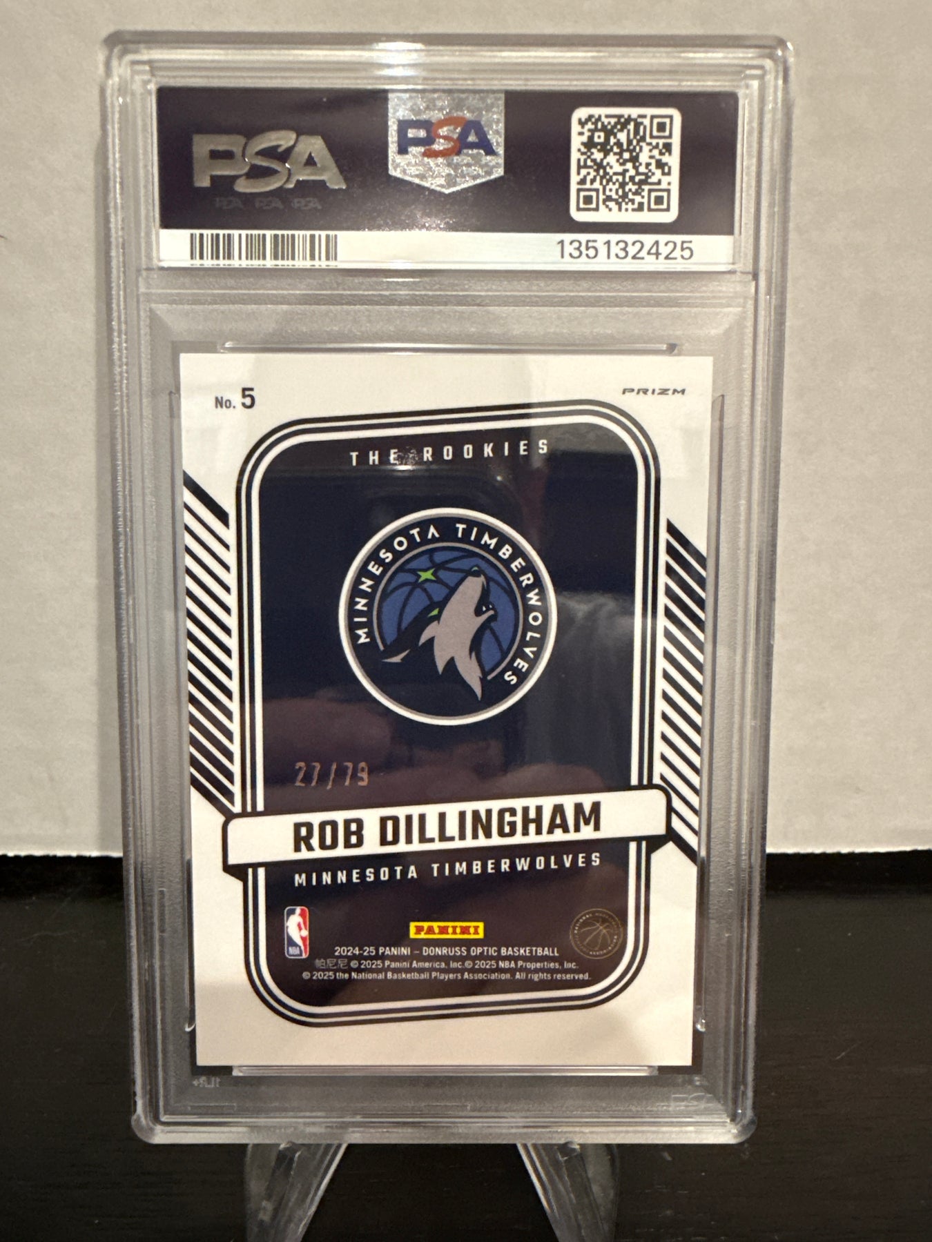 Rob Dillingham 2024 Panini Donruss Optic The Rookies Pink Velocity, 27/79, PSA 9 Mint, Card Number 5PSA Certification 135132425Card Stand sold separately.