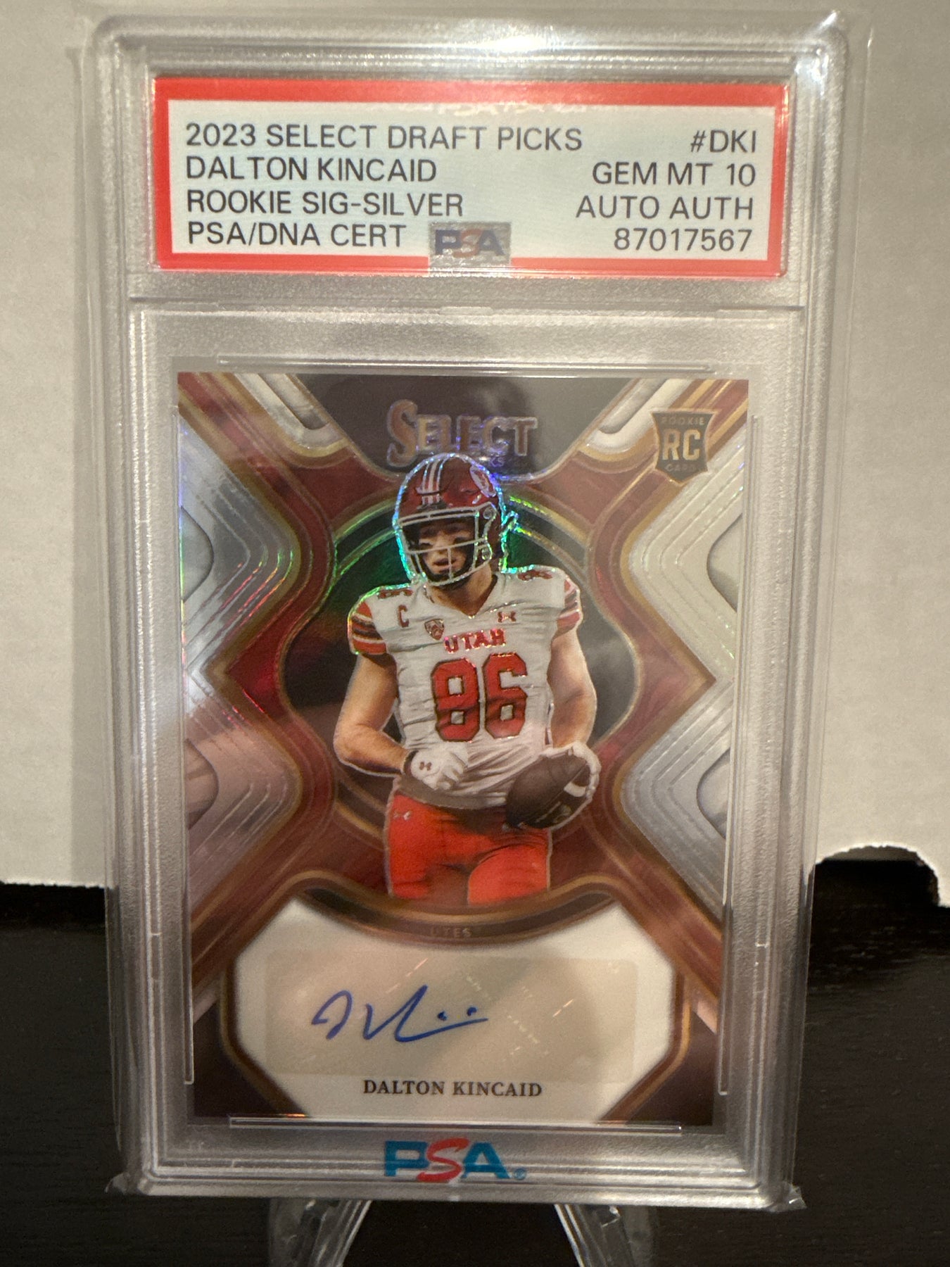 Dalton Kincaid 2023 Panini Select Draft Picks Rookie Auto Silver, PSA 10 Gem Mint, Card Number RSDKIPSA Certification 87017567Card Stand sold separately.