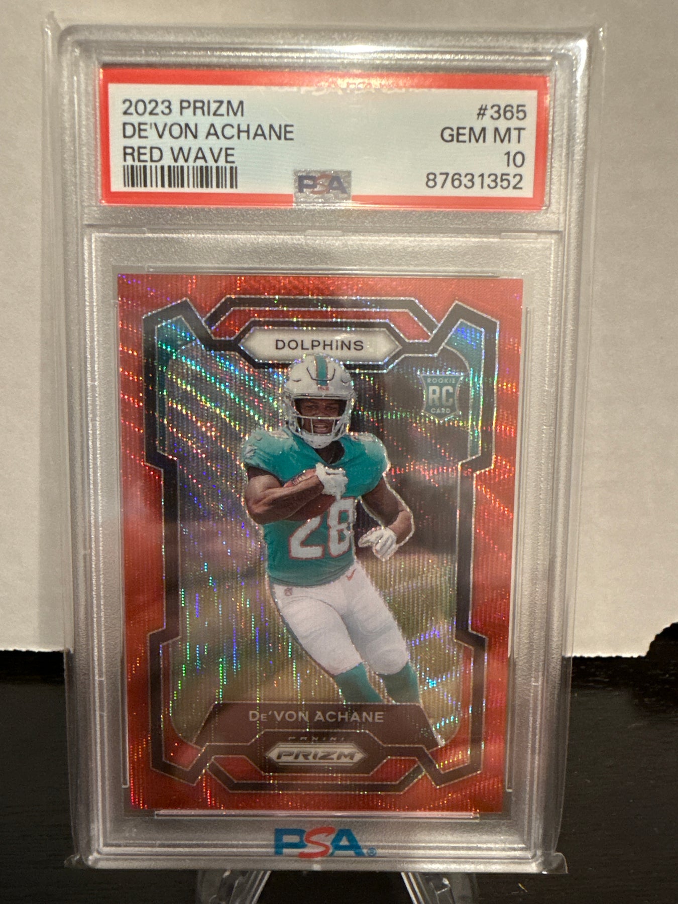 De'Von Achane 2023 Panini Prizm Red Wave Rookie, 086/149, PSA 10 Gem Mint, Card Number 365