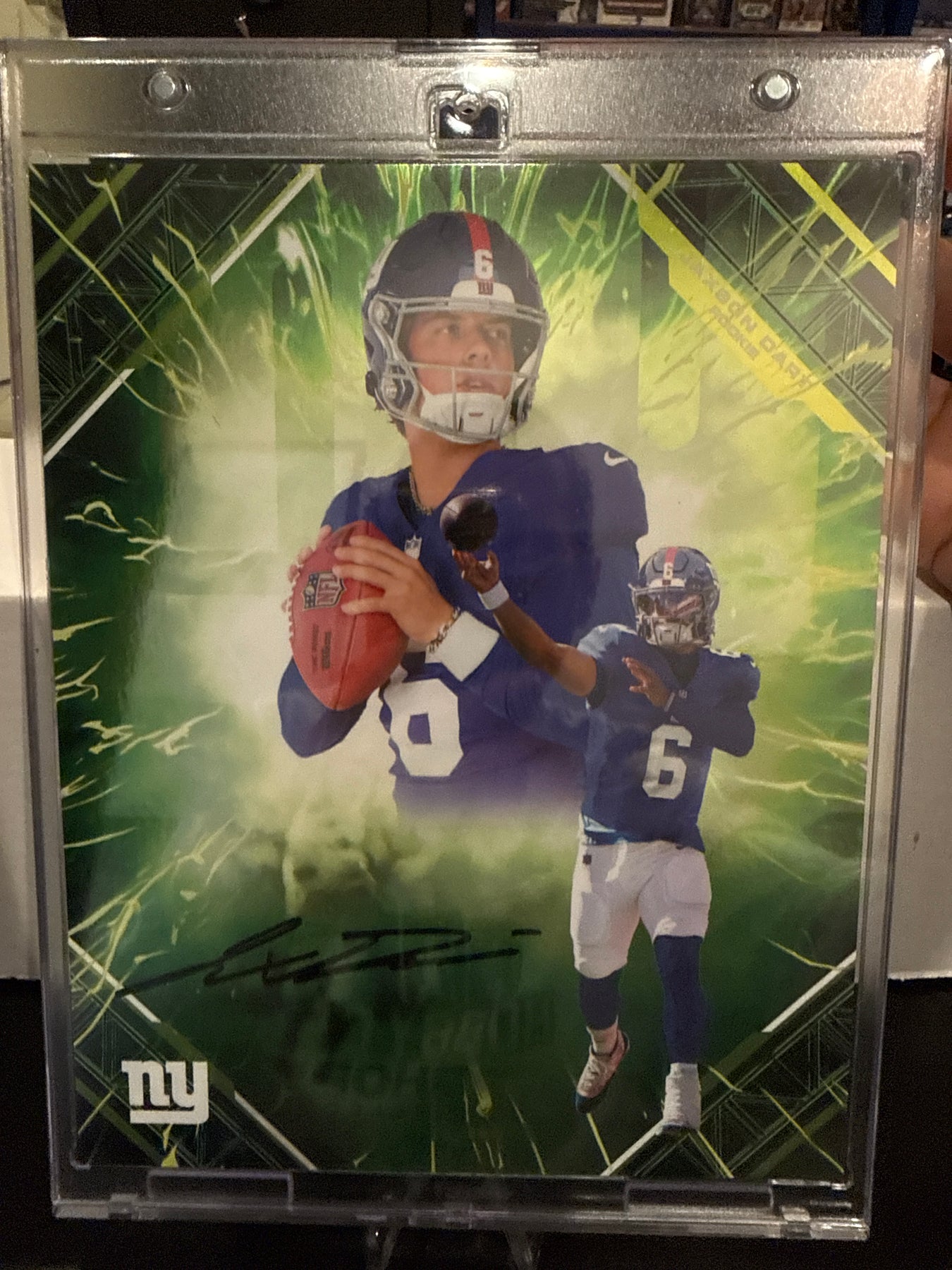 Jaxson Dart 2025 Fanatics Emanate Collectable Jumbo Autograph Rookie Card Green, 18/99Card Stand sold separately.