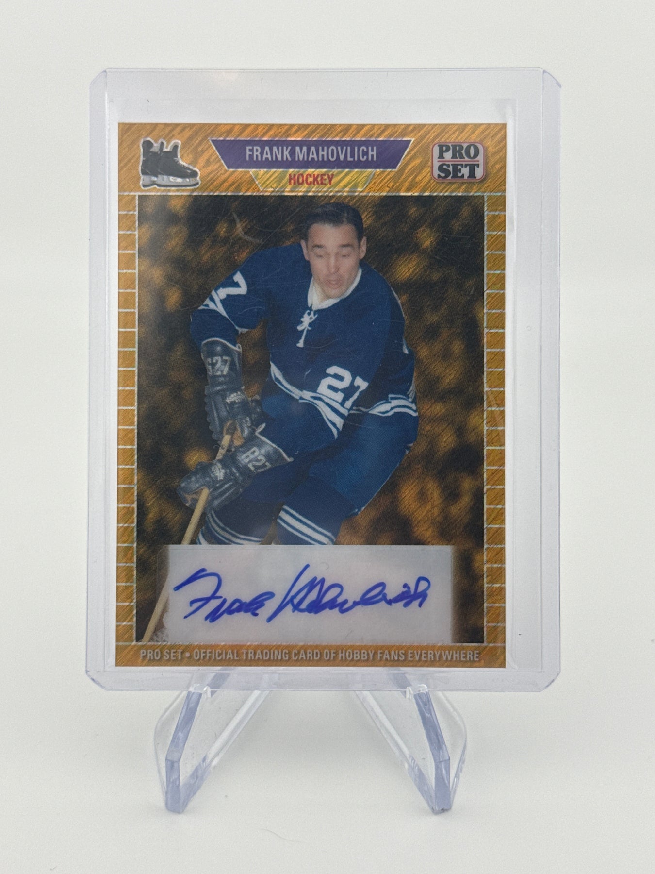 Frank Mahovlich 2025 Leaf Pro Set Gold Shimmer 1/1 Auto, Card Number 89AFM1Card Stand sold separately.