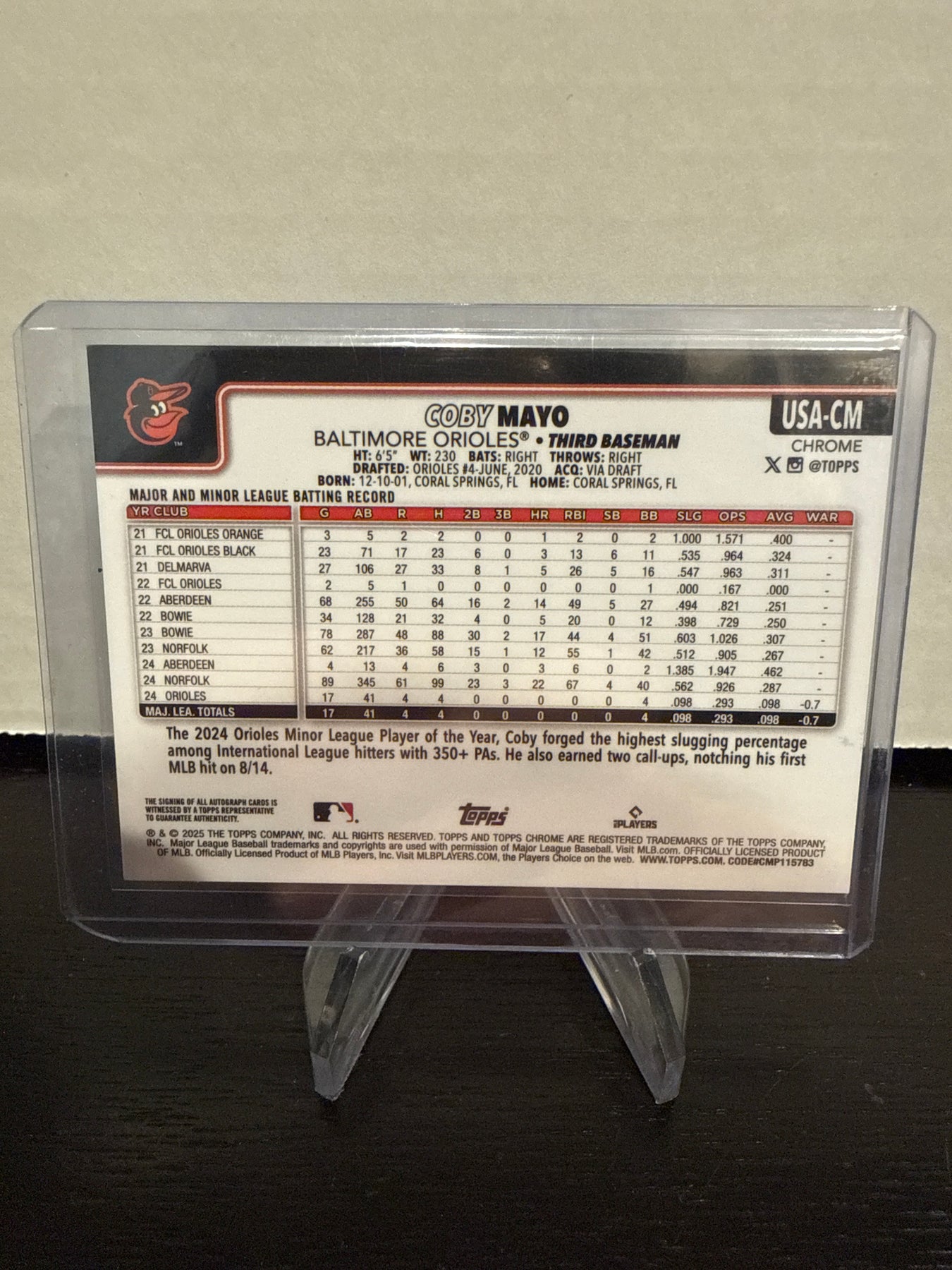 Coby Mayo 2025 Topps Chrome Update Sapphire Rookie Auto, 041/199, Card Number USACMCard Stand sold separately.