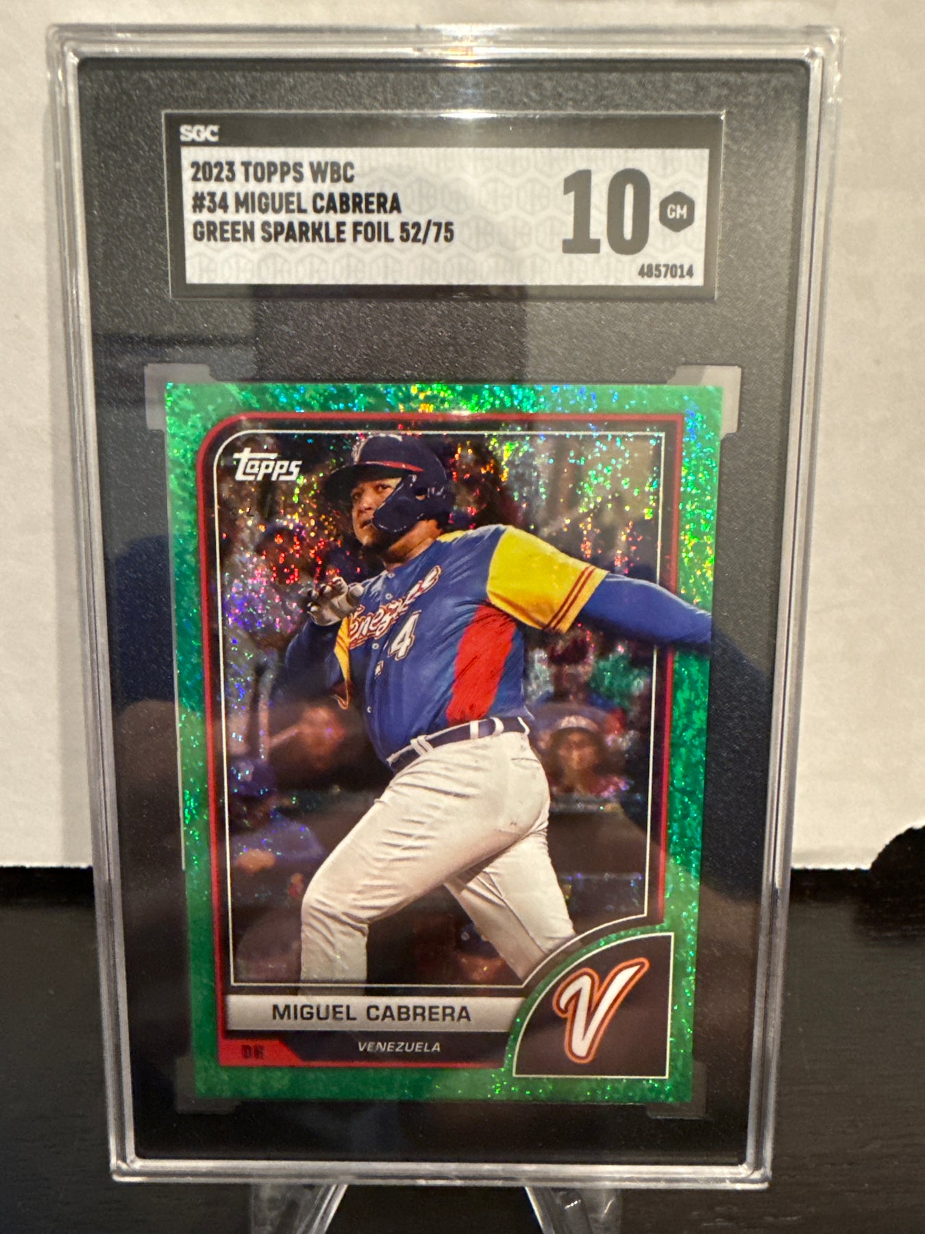 Miguel Cabrera 2023 Topps World Baseball Classic Green Sparkle Foil, 52/75, SGC 10 Gem Mint, Card Number 34SGC Certification 4857014Card Stand sold separately.