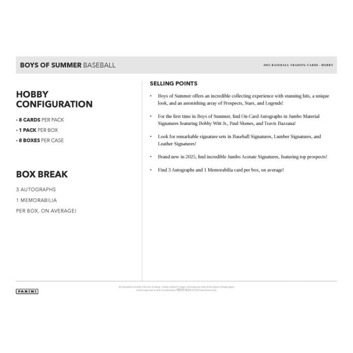 2025 Panini Baseball Boys of Summer Hobby Box at a glance:
