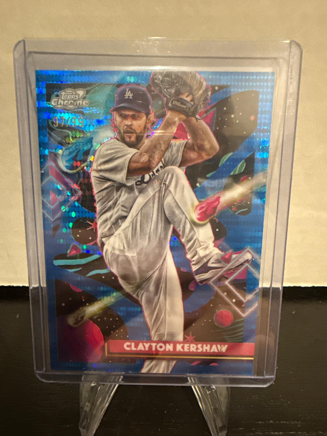 Clayton Kershaw 2025 Topps Chrome Cosmic Blue Seismic Refractor, 97/99
