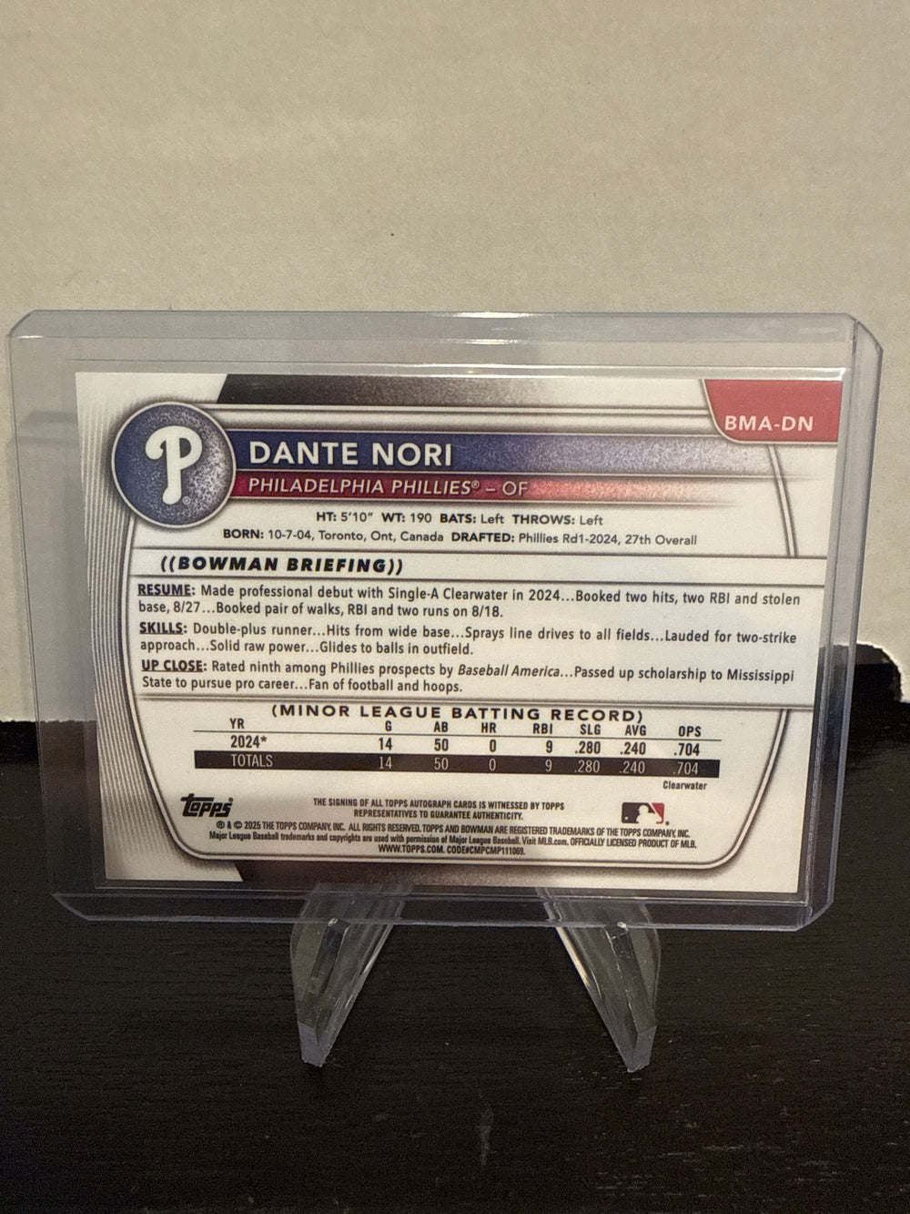 Dante Nori 2025 Bowman Chrome Mega Box Purple Mojo Auto, 017/199, Card Number BMADNCard Stand sold separately.