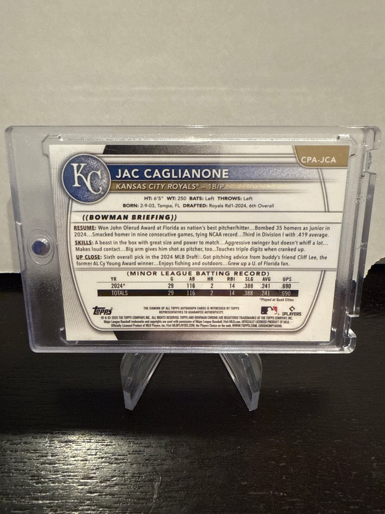 Jac Caglianone 2025 Bowman Chrome Prospect Auto, Card Number CPAJCACard Stand sold separately.