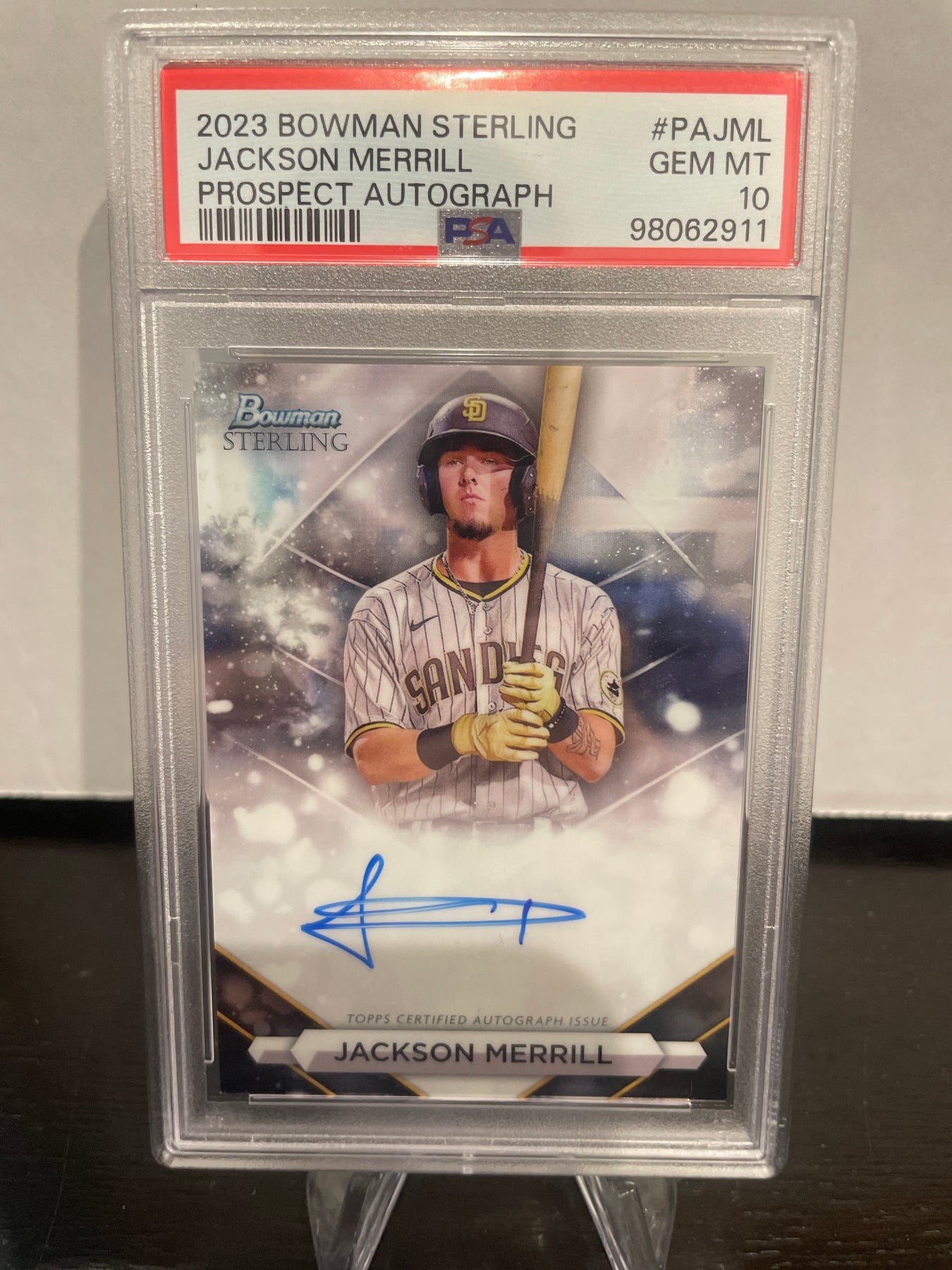 Jackson Merrill 2023 Bowman Sterling Prospect Auto, PSA 10 Gem Mint, Card Number PAJMLPSA Certification 98062911Card Stand sold separately.