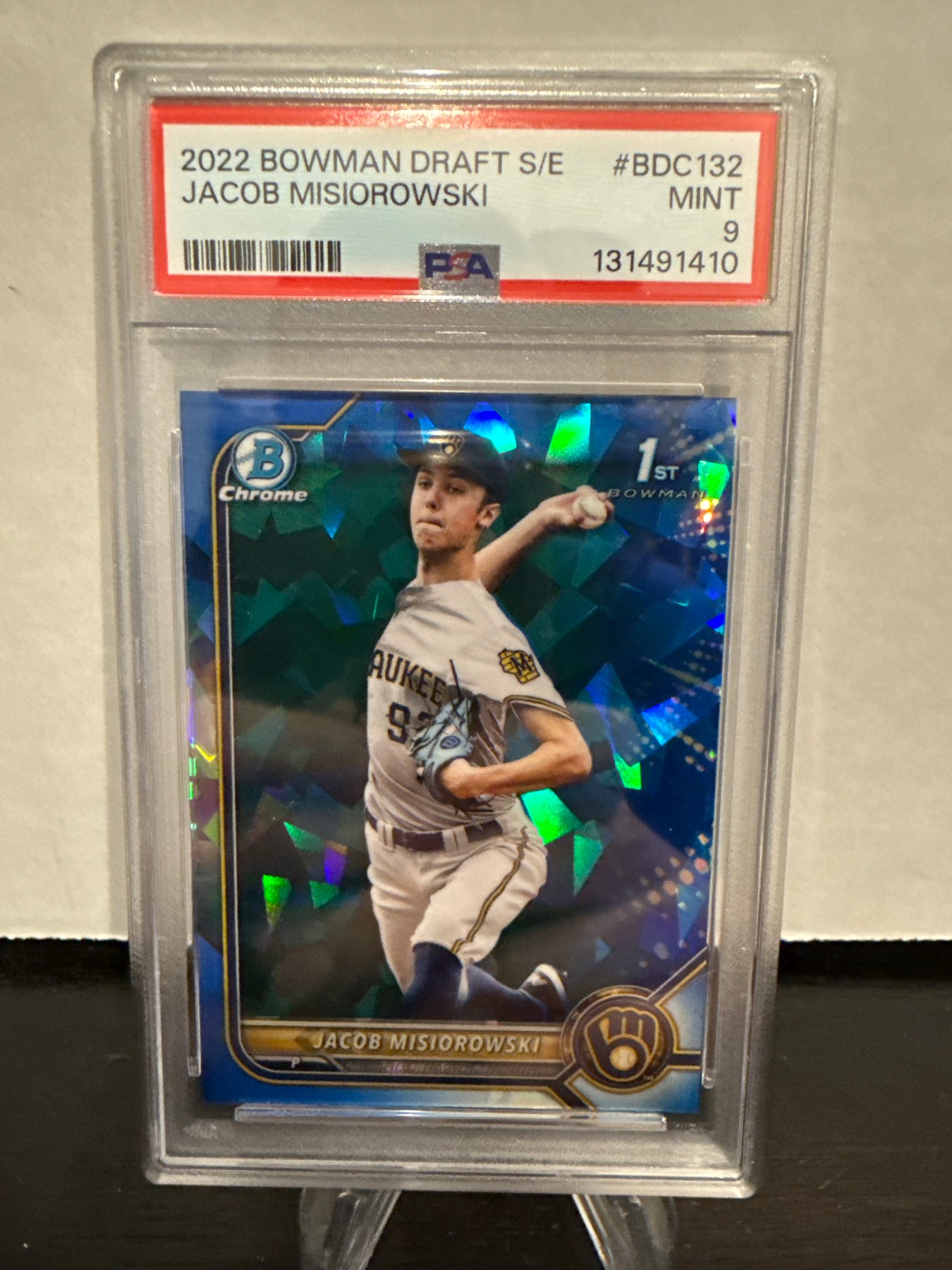 Jacob Misiorowski 2022 Bowman Draft Sapphire 1st, PSA 9 Mint, Card Number BDC132PSA Certification 131491410Card Stand sold separately.