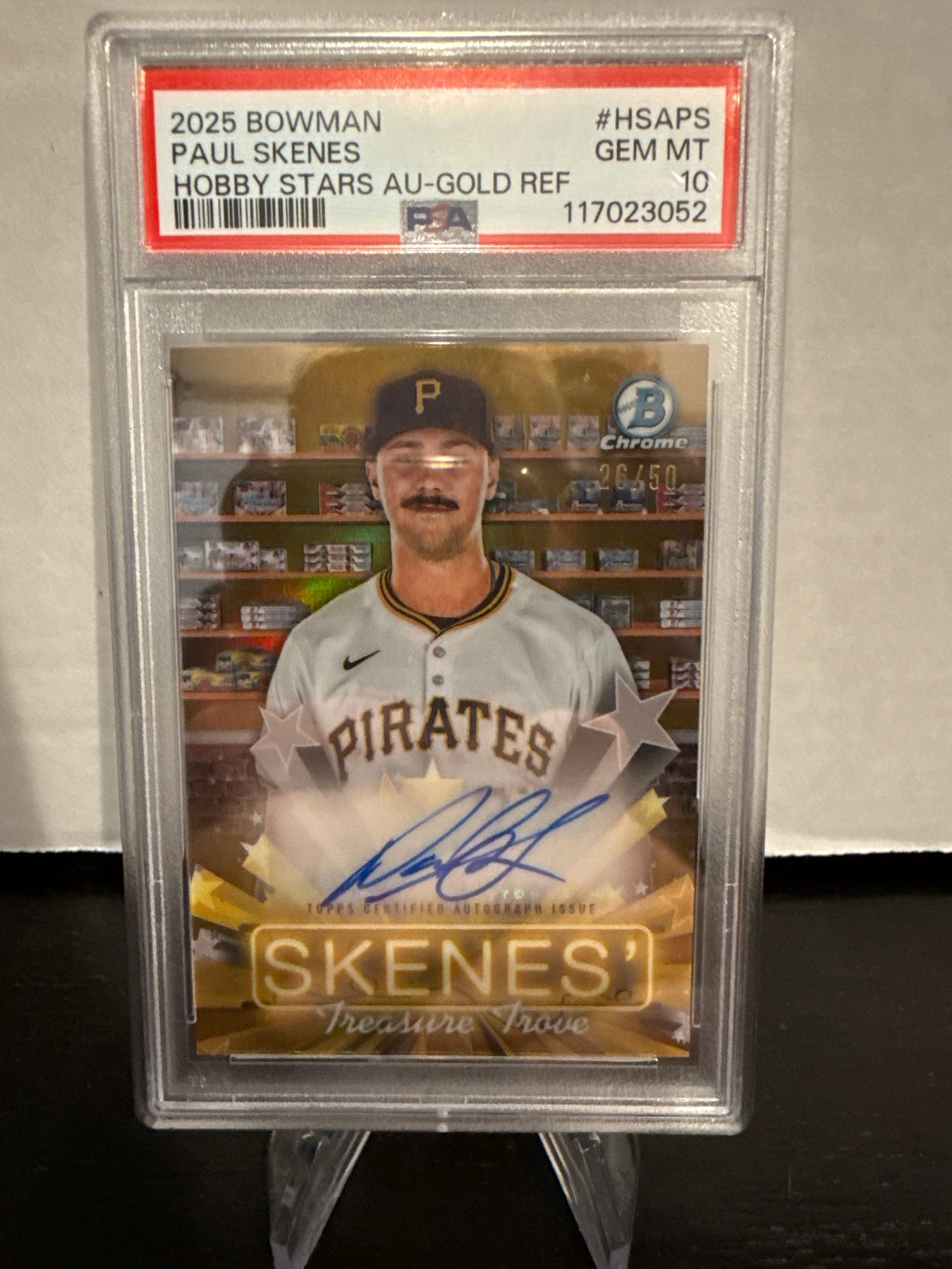 Paul Skenes 2025 Bowman Chrome Hobby Stars Gold Refractor Auto, 26/50, PSA 10 Gem Mint, Card Number HSAPSPSA Certification 117023052Card Stand sold separately.