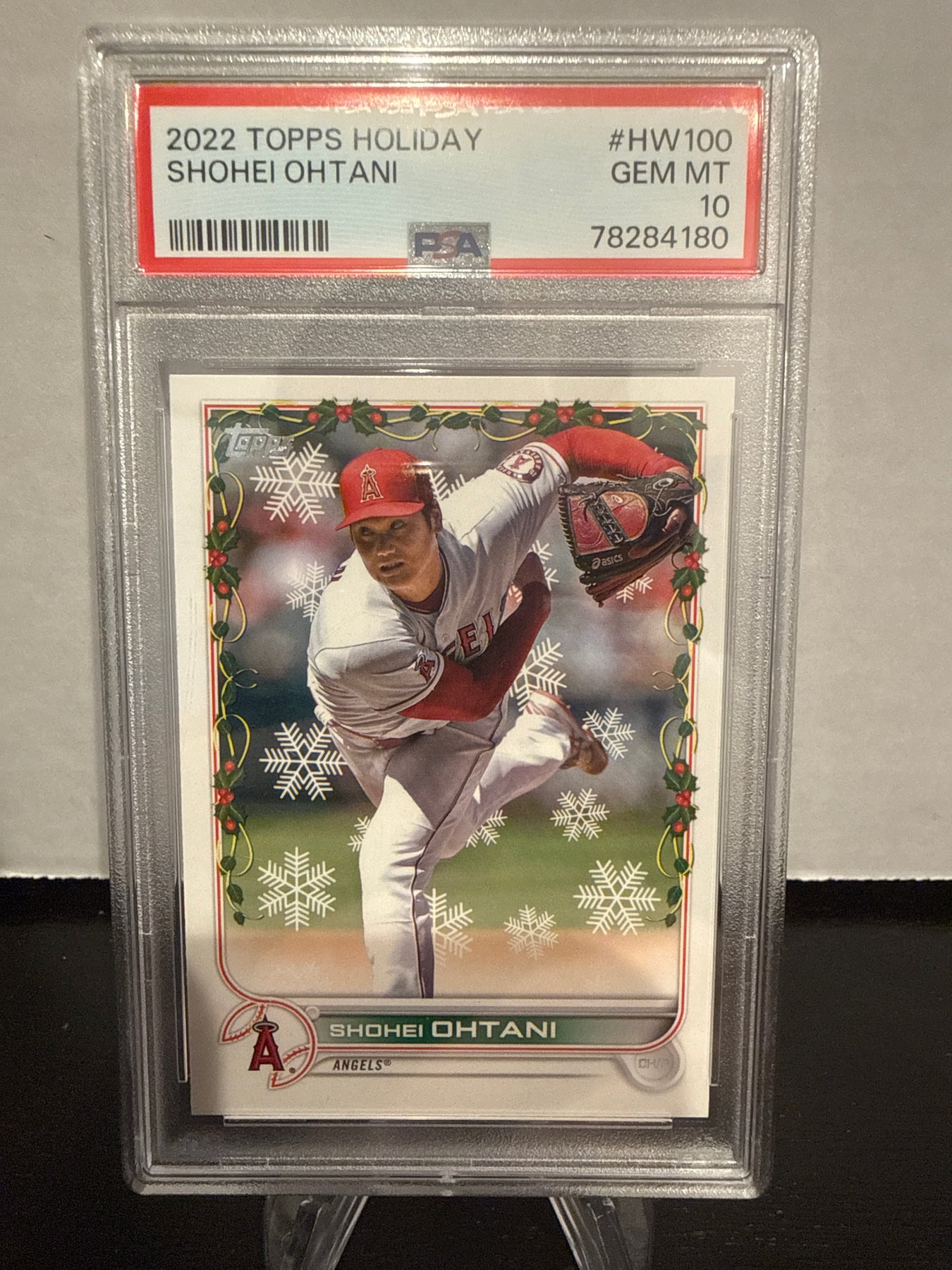 Shohei Ohtani 2022 Topps Holiday, PSA 10 Gem Mint, Card Number HW100PSA Certification 78284180Card Stand sold separately.