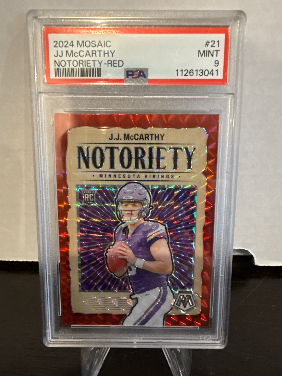 JJ McCarthy 2024 Panini Mosaic Notoriety Red Rookie, PSA 9 Mint
