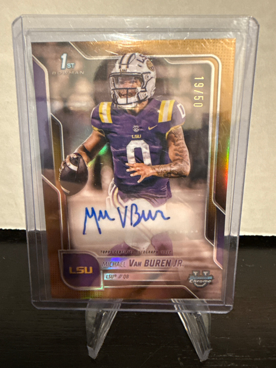Michael Van Buren Jr 2025 Bowman University Chrome 1st Prospect Gold Refractor Auto, 19/50
