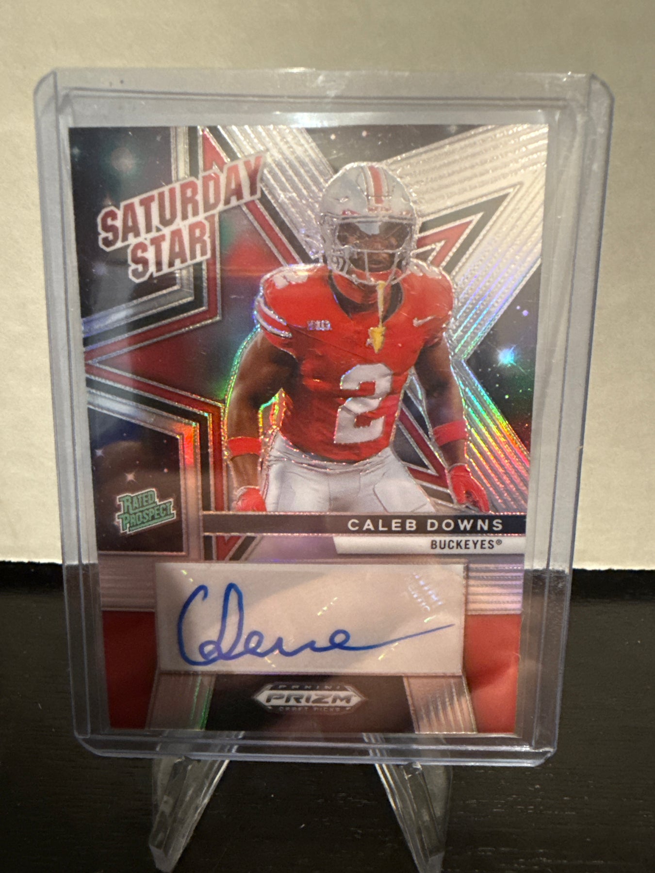Caleb Downs 2025 Panini Prizm Draft Picks Saturday Star Silver Prospect Auto, Card Number SSSCDSCard Stand sold separately.