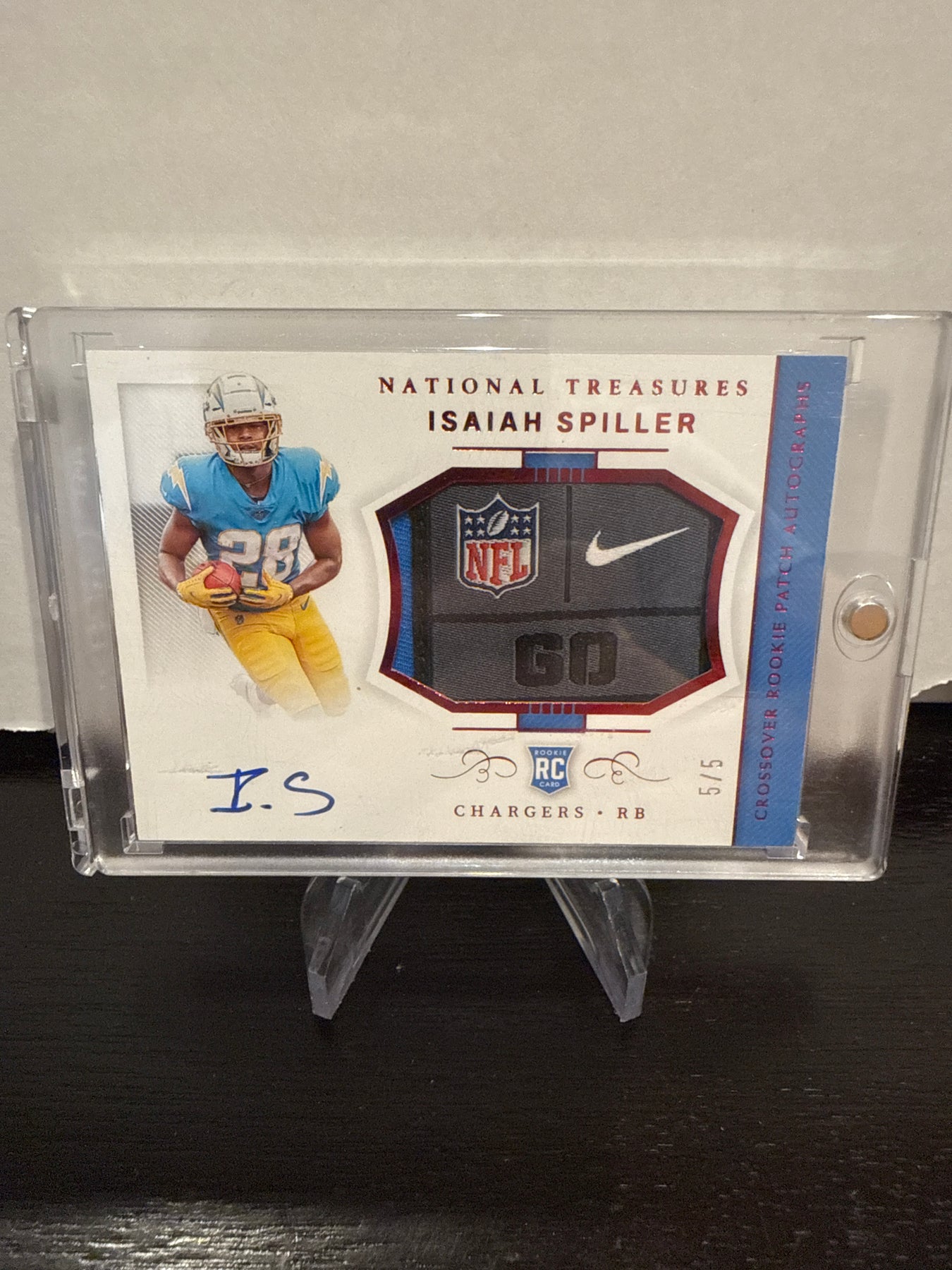Isaiah Spiller 2022 Panini National Treasures Rookie Jersey Tag Auto, 5/5, Card Number CRPAISCard Stand sold separately.