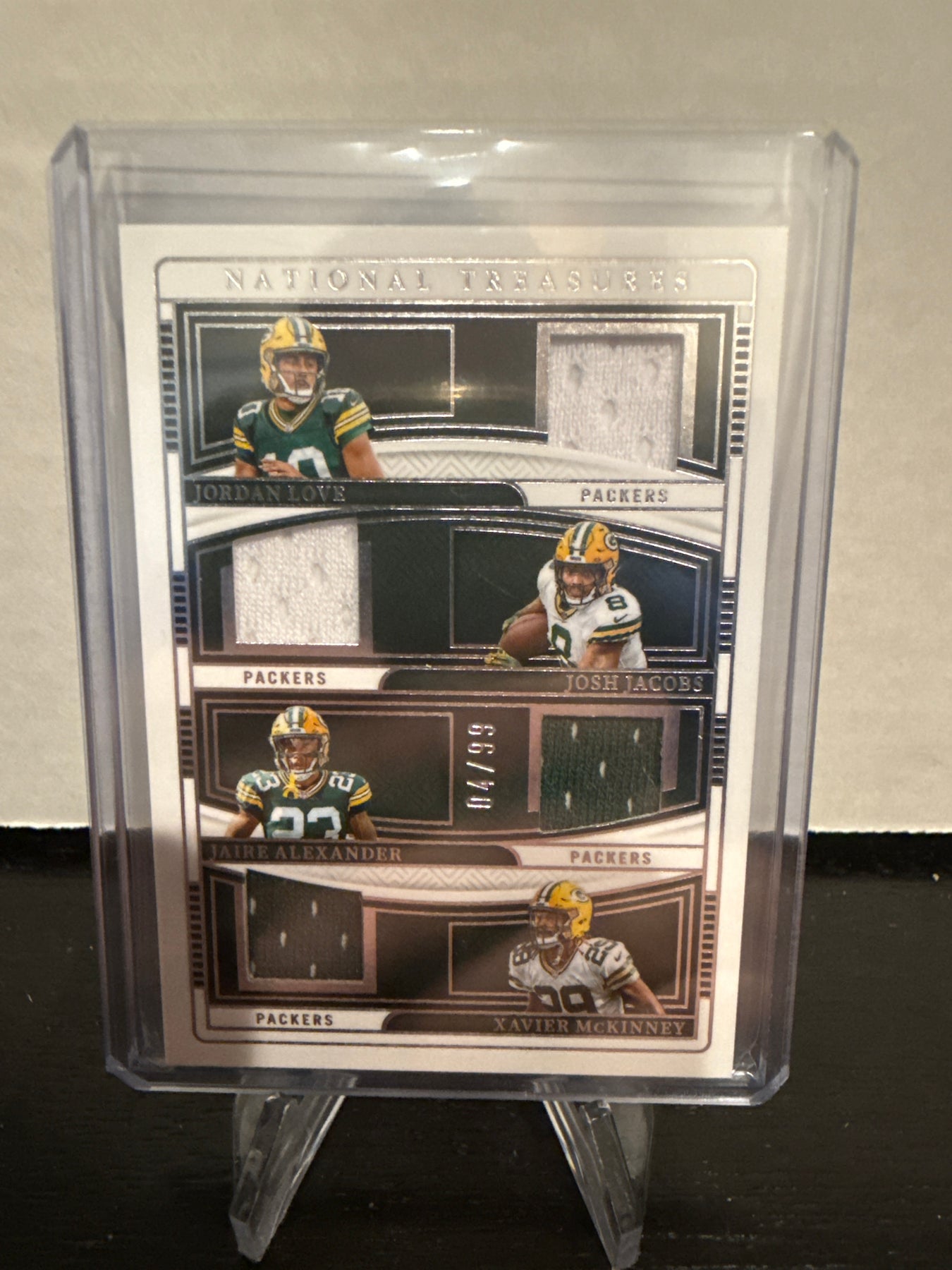 Jordan Love/Josh Jacobs/Jaire Alexander/Zavier McKinney 2024 Panini National Treasures Green Bay Packers Quad Team Relic, 04/99, Card Number NGQGBCard Stand sold separately.
