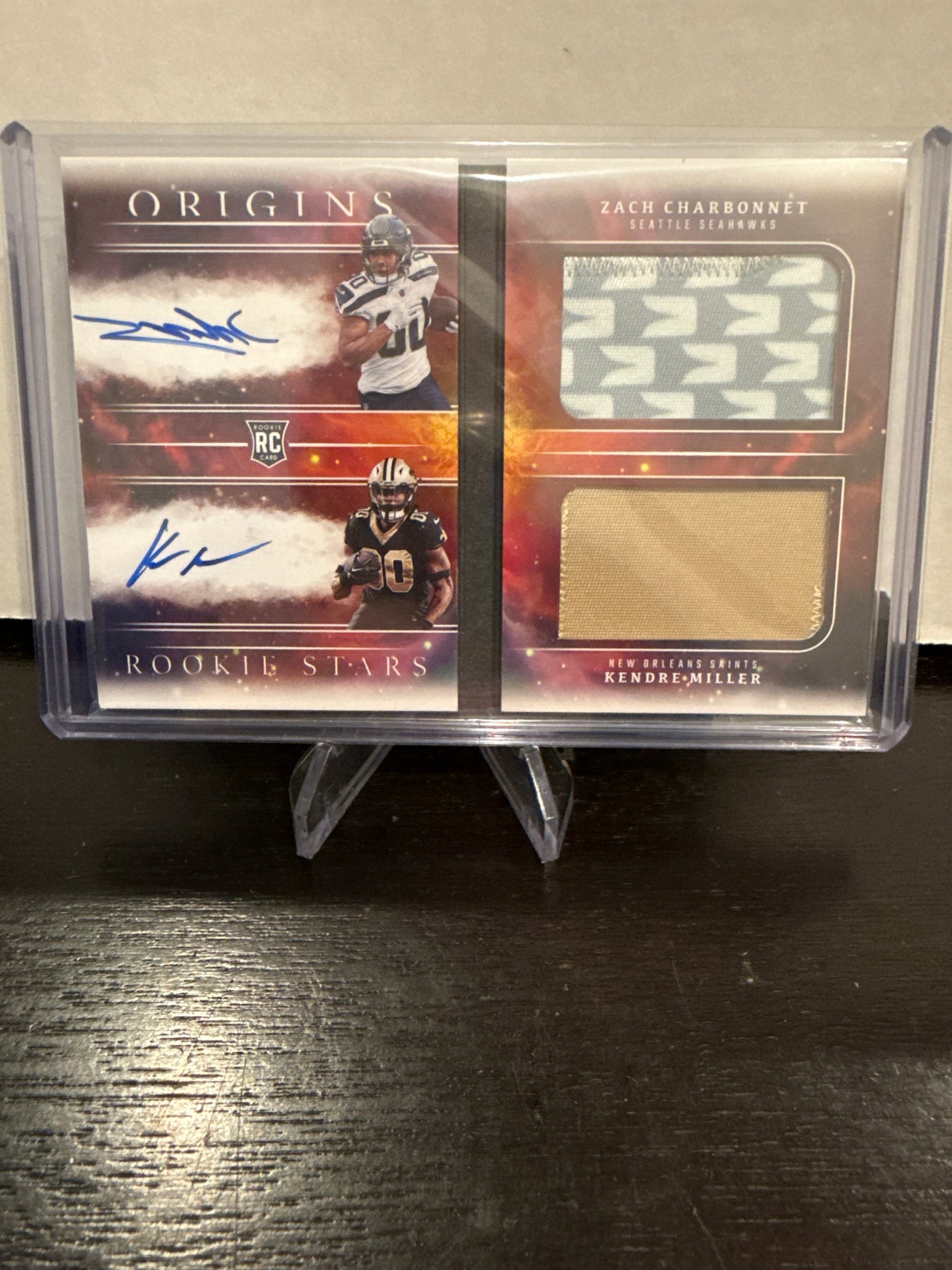 Zach Charbonnet/Kendre Miller 2023 Panini Origins Rookie Patch Auto Booklet Dual, 07/49, Card Number BRB2Card Stand sold separately.