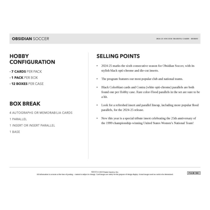 2024-2025 Panini Obsidian Soccer Hobby Box at a glance: