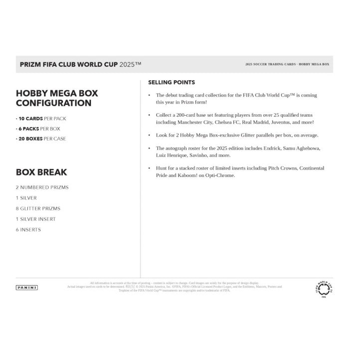 2025 Panini Prizm FIFA Club World Cup Soccer Hobby Mega Box at a glance: