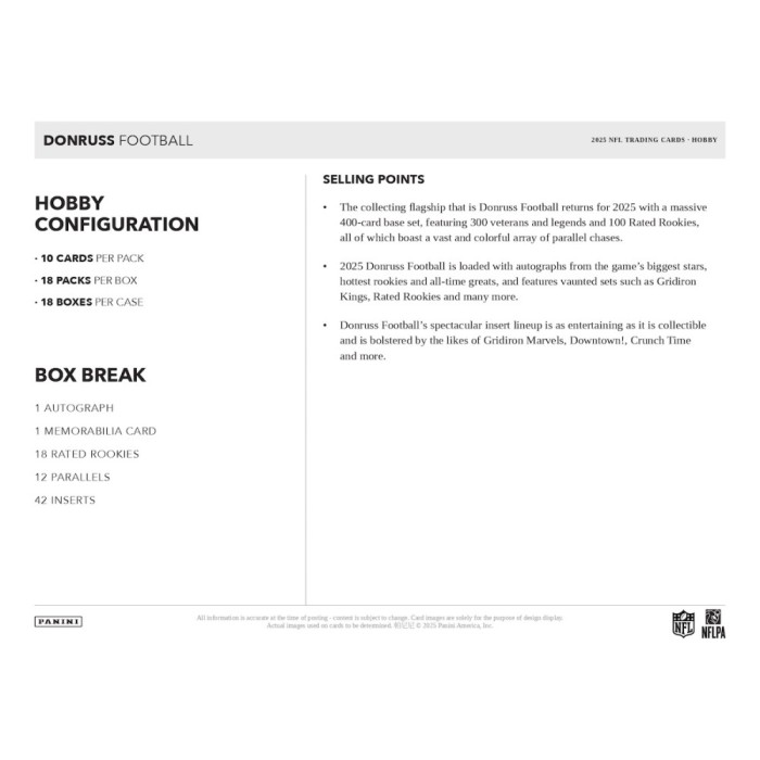 2025 Panini Donruss Football Hobby Box at a glance: