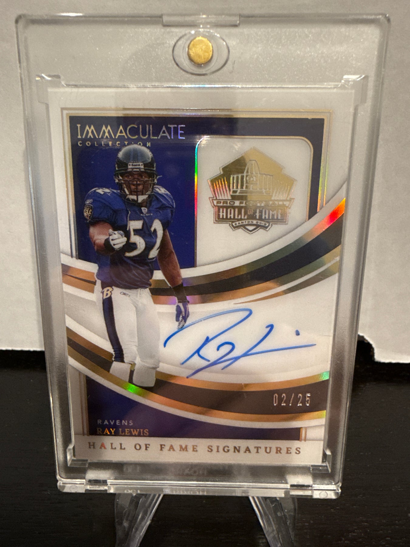Ray Lewis 2022 Panini Immaculate Hall of Fame Signatures, 02/25, Card Number HFSRLECard Stand sold separately.